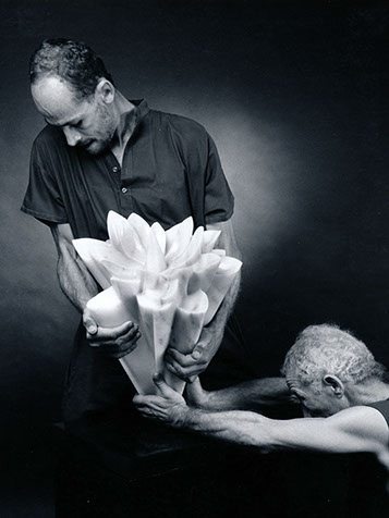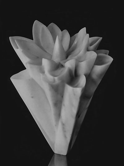 Slowly, while reading a particular book or listening to some music, the answer dawned on me, just by way of association. Shreds of a conversation I had with Nirman came back to me. Had he not told me that the rising lines were inspired by the sun‘s rays, falling through forest trees? Suddenly, the white marble sclupture expressed something beyond itself. The contrasts were merging: the rising light rays led to the petals’ opening up… A rocket seemed to explode. Together, the very masculine and the very feminine shapes gave way to a third dimension: The stone successfully demonstrates not only the growth and unfolding of a plant, but, beyond that, also the intrinsically human striving for something higher.